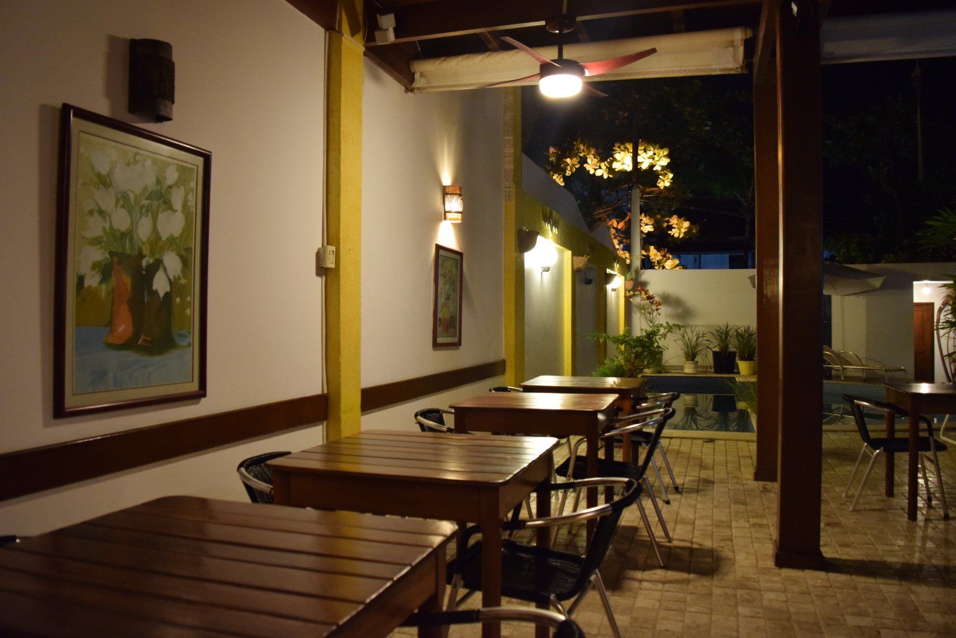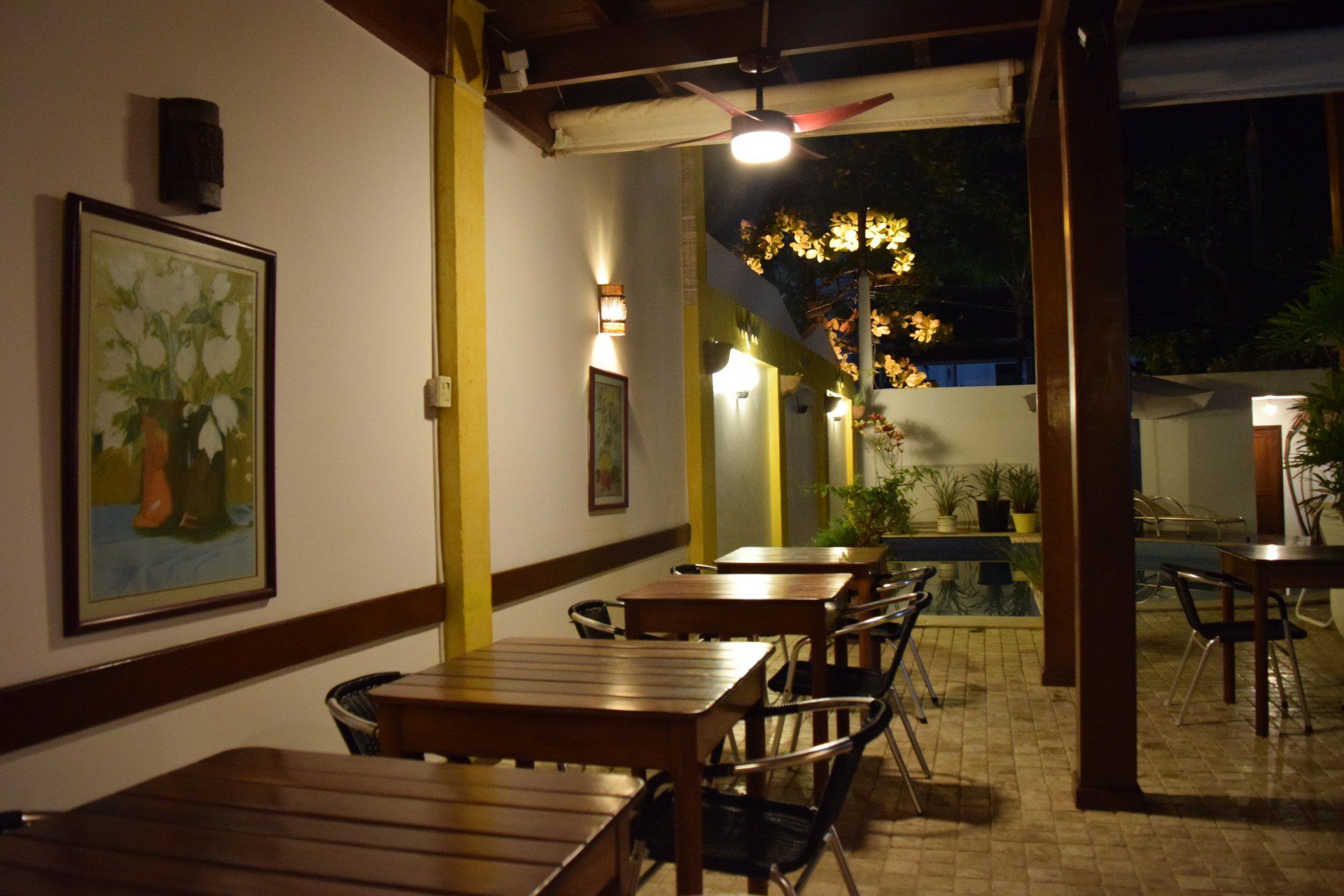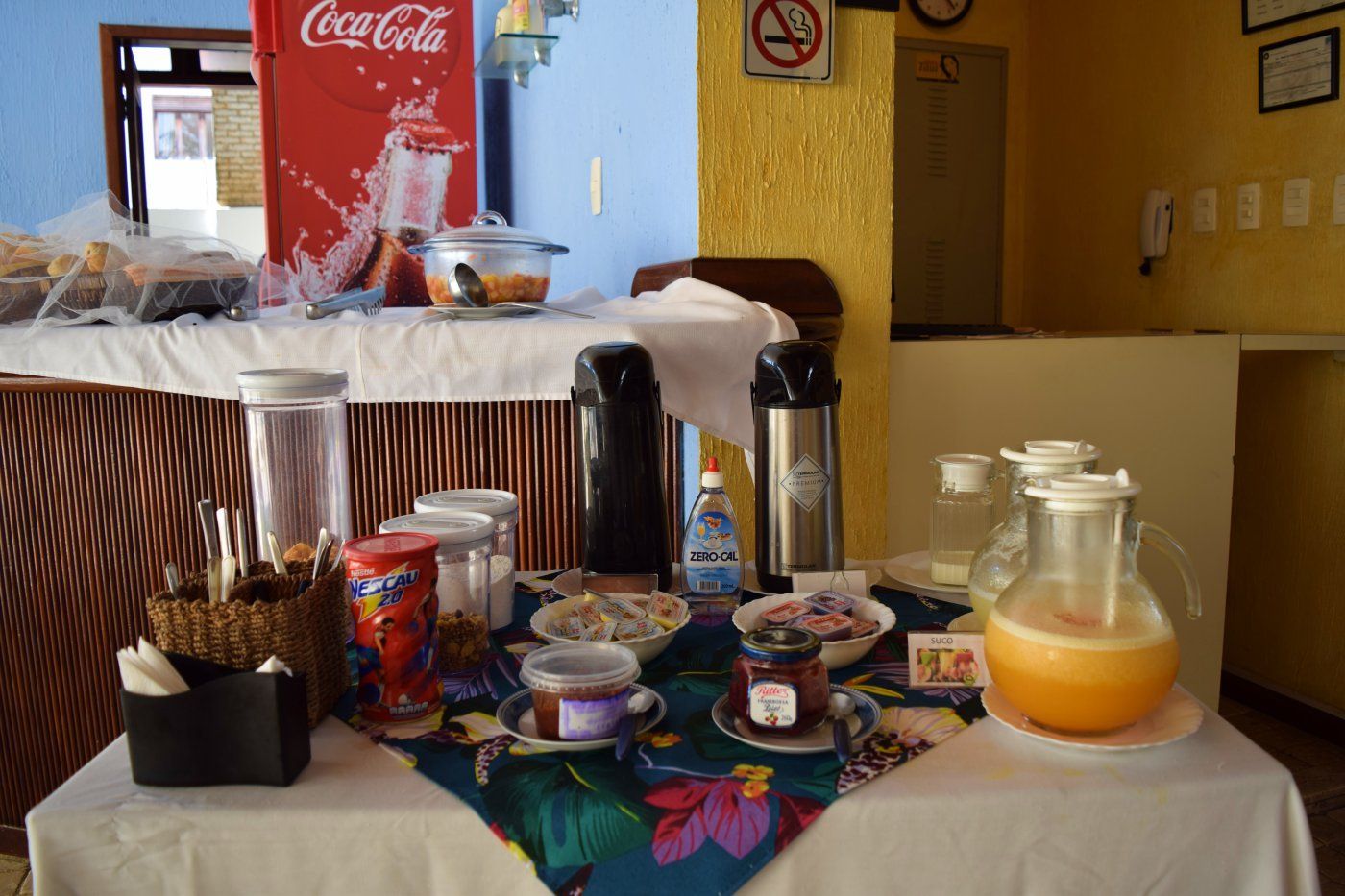 Nosso Espaço de Café da Manhã também serve como Bar em frente a Piscina e oferece pequenos lanches, drinques e congelados, podendo ser feitos pedidos aos restaurantes que se encontram em volta da Pousada.